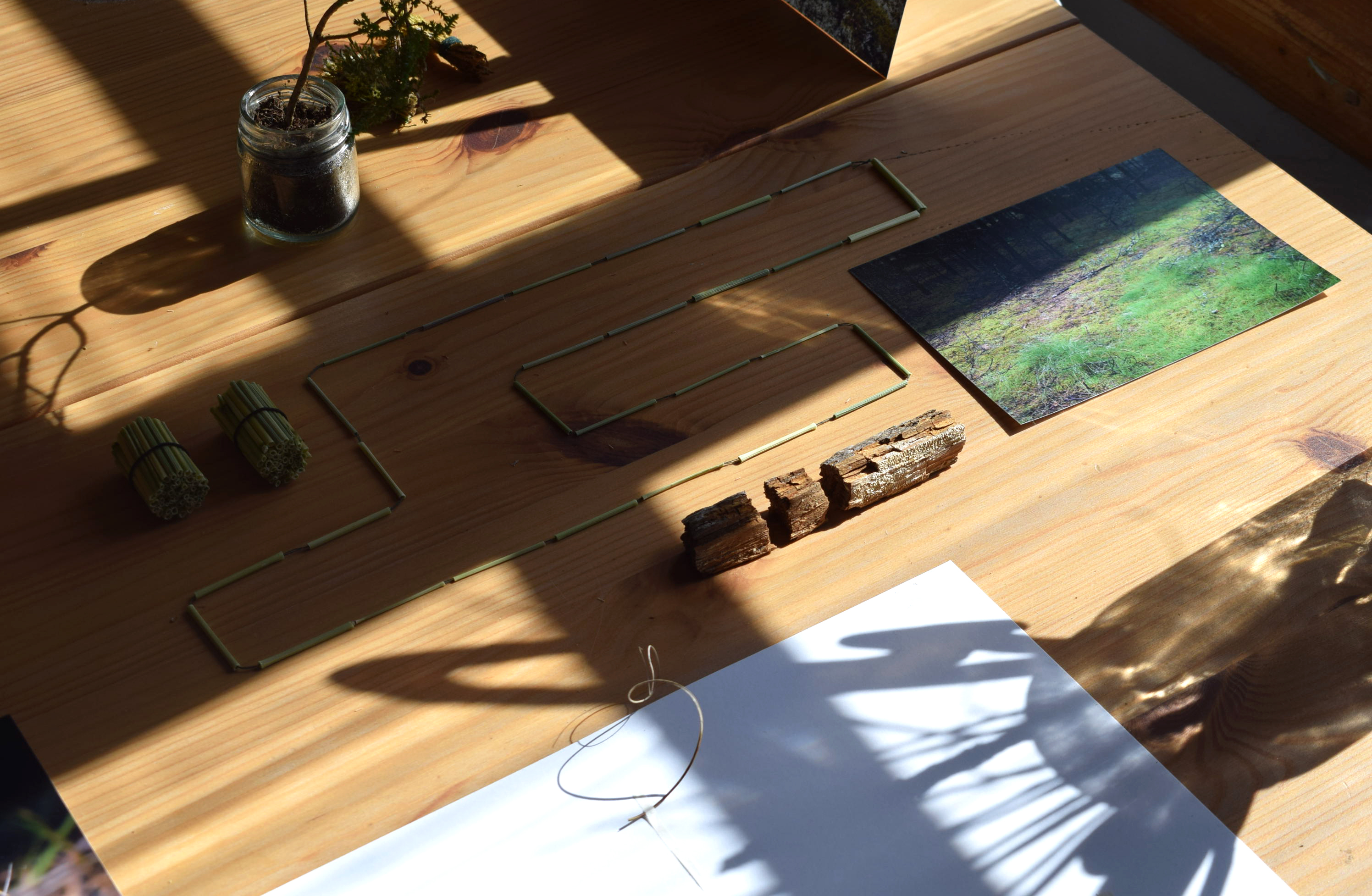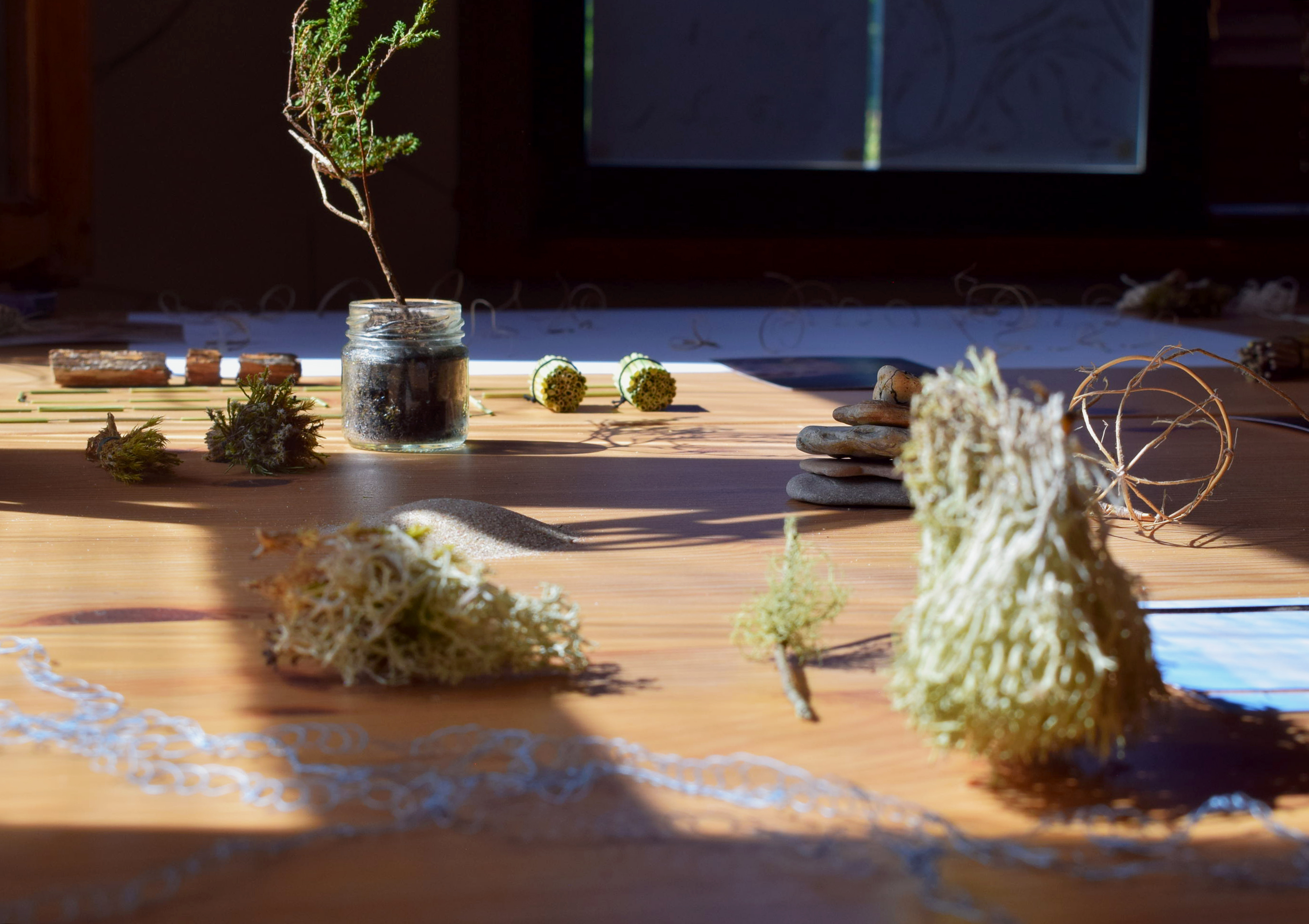 Lichen, pebbles, wood, thread, moss, grass, shells, amber, sand, wild clay